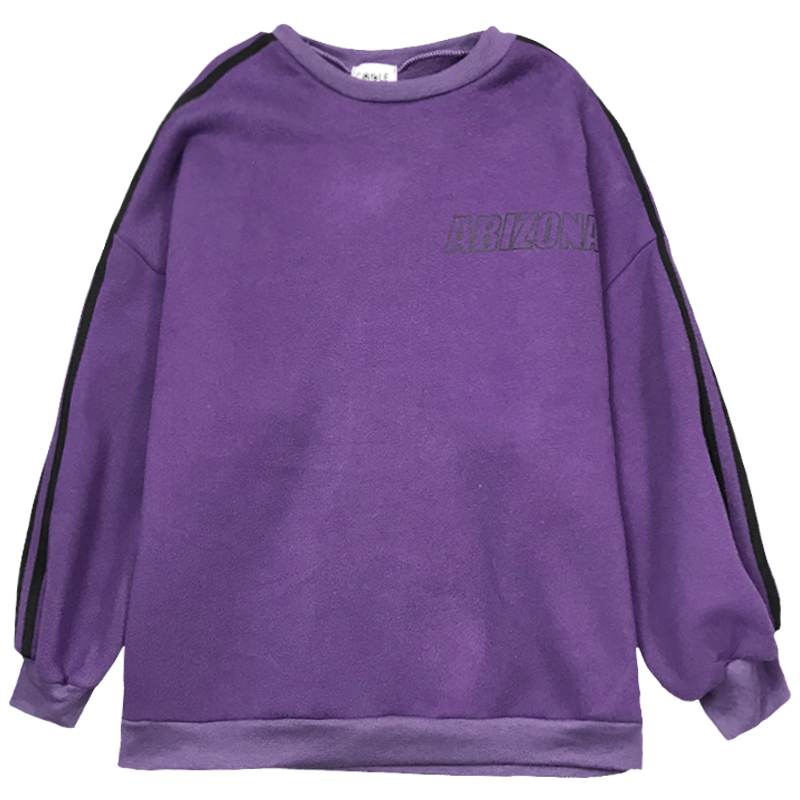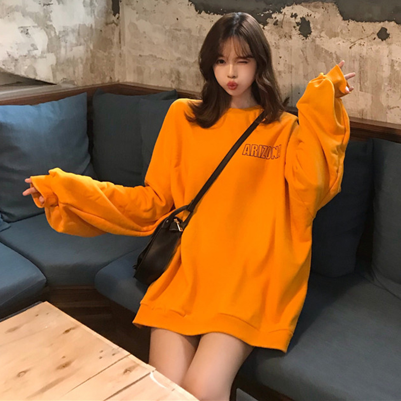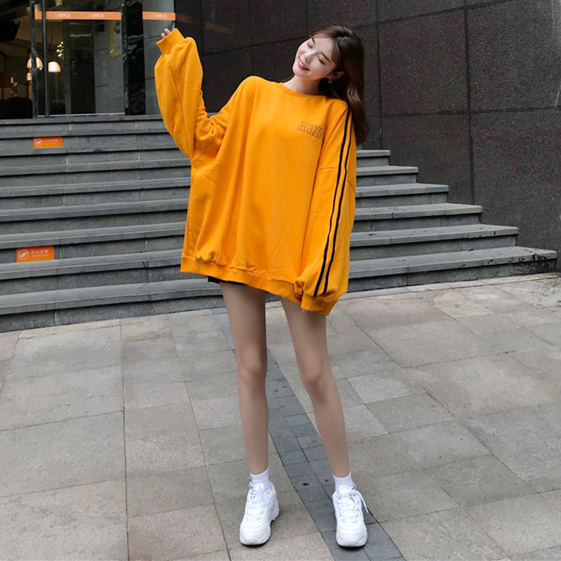 / 字母印花中長款外套秋冬女裝新款加絨衛衣拼色條紋寬松長袖上衣潮