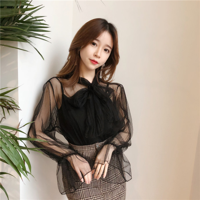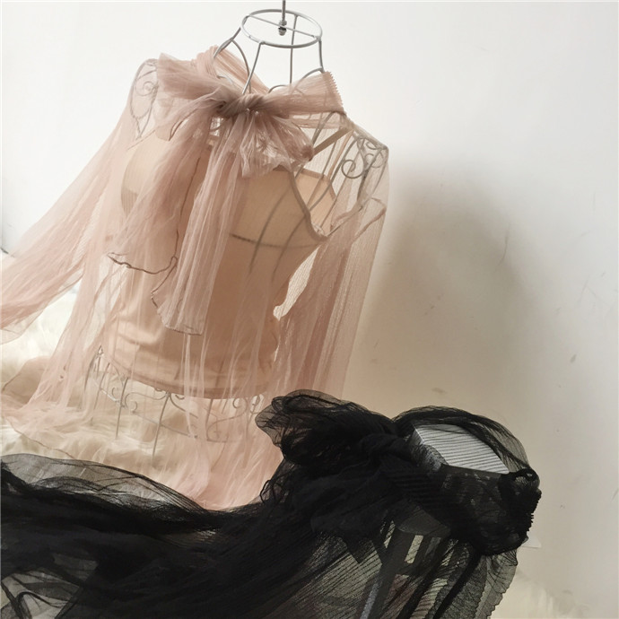 / 2018新款韓版時尚套裝港味Chic短款吊帶背心薄款系帶蝴蝶結網紗潮