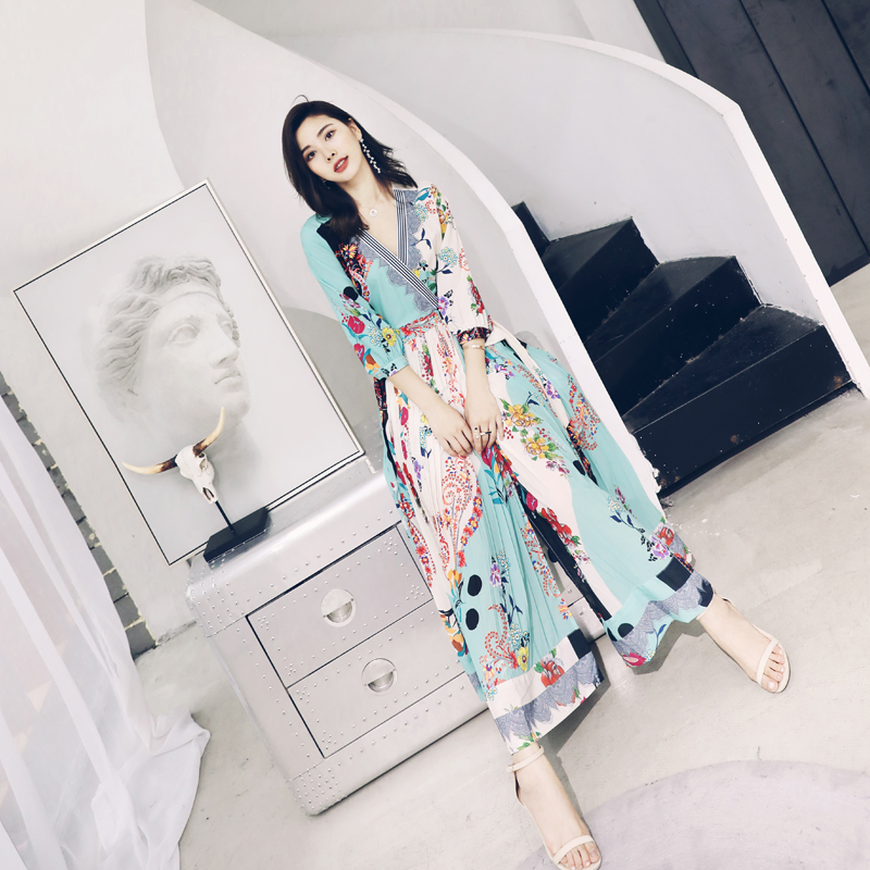 S秀淑女氣質拼接印花波浪連衣裙女2018夏季新款V領五分袖荷葉邊裙