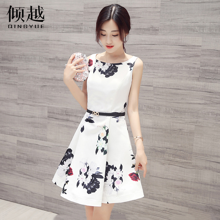 / 2017夏裝新款氣質淑女雪紡連衣裙無袖修身顯瘦束腰中長款印花裙子