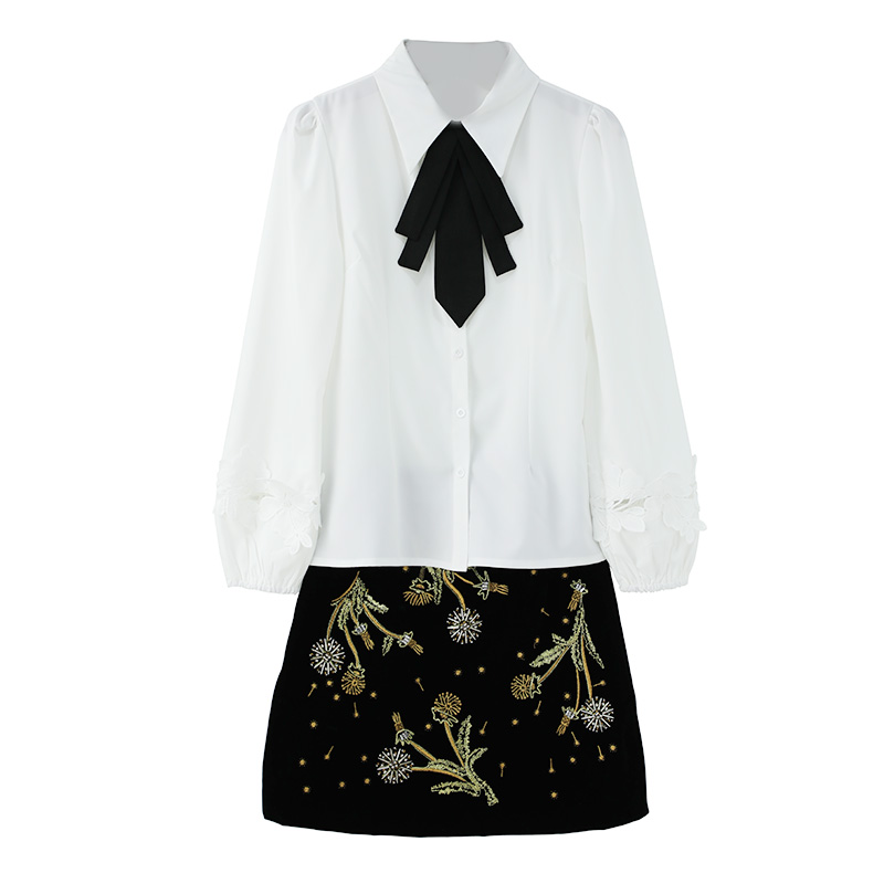 2018秋季新款甜美長袖襯衫上衣高腰復古刺繡A字半裙短裙網紅套裝