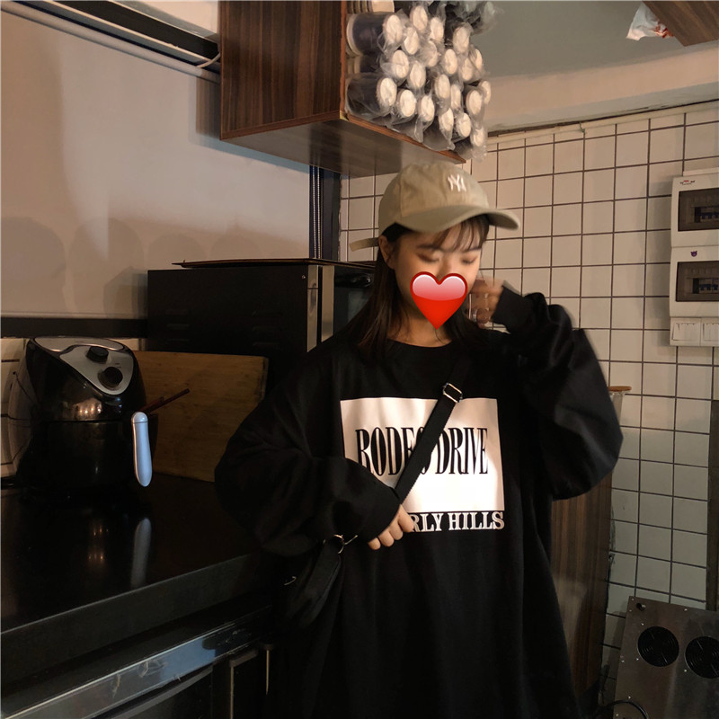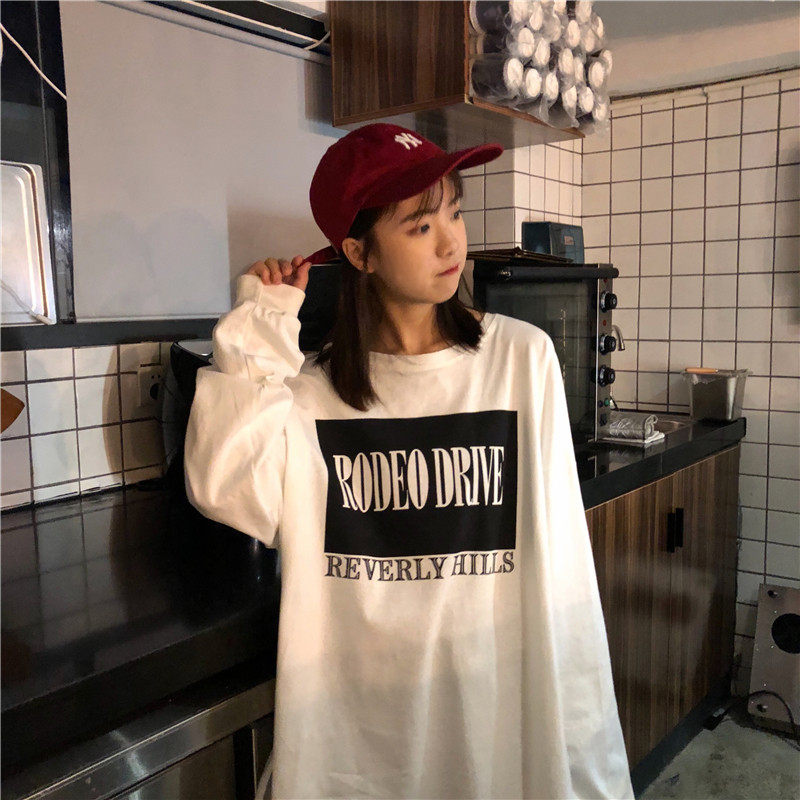 / 秋季女裝韓版中長款原宿風復古寬松字母休閑帥氣長袖T恤顯瘦上衣