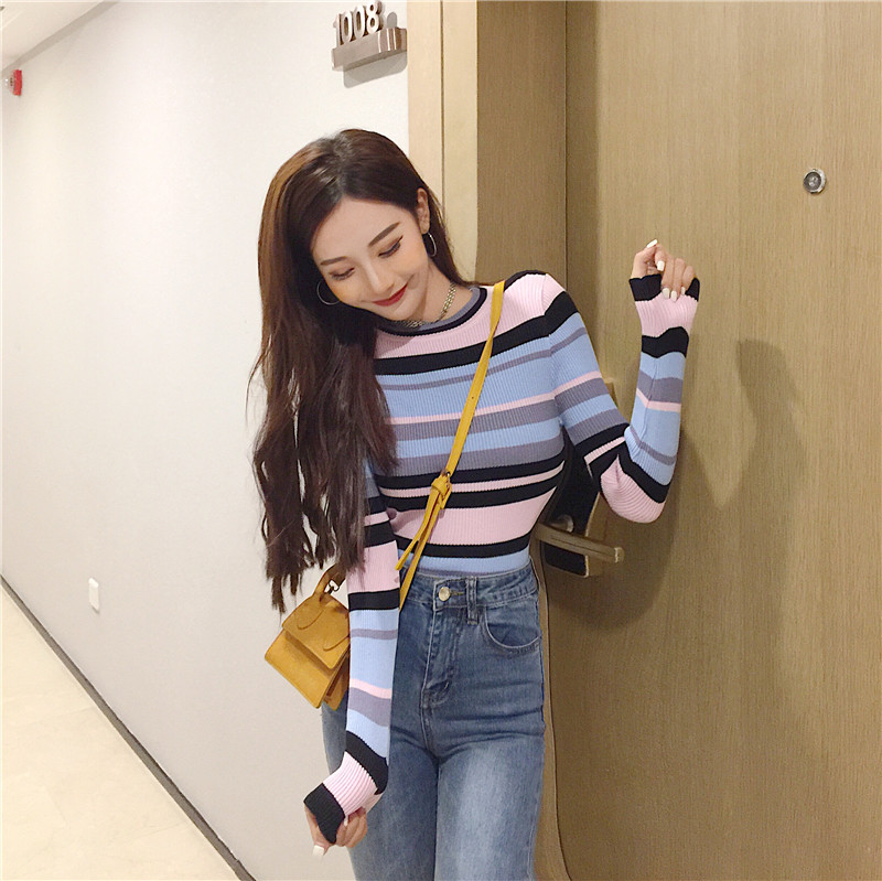 時尚秋裝女2018新款氣質百搭韓版拼色彩條圓領顯瘦針織衫打底衫潮