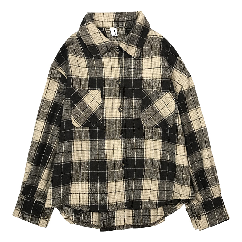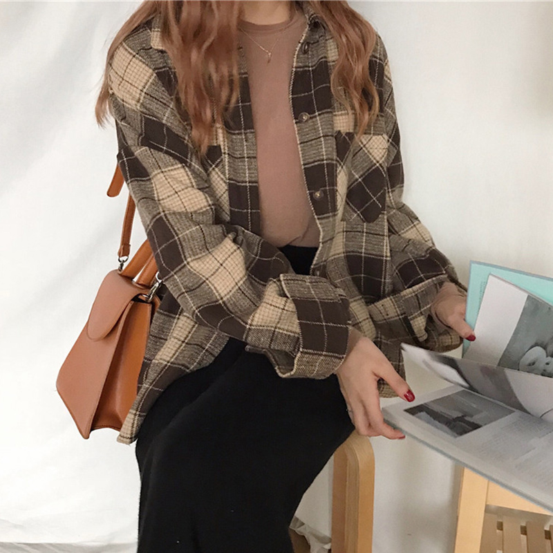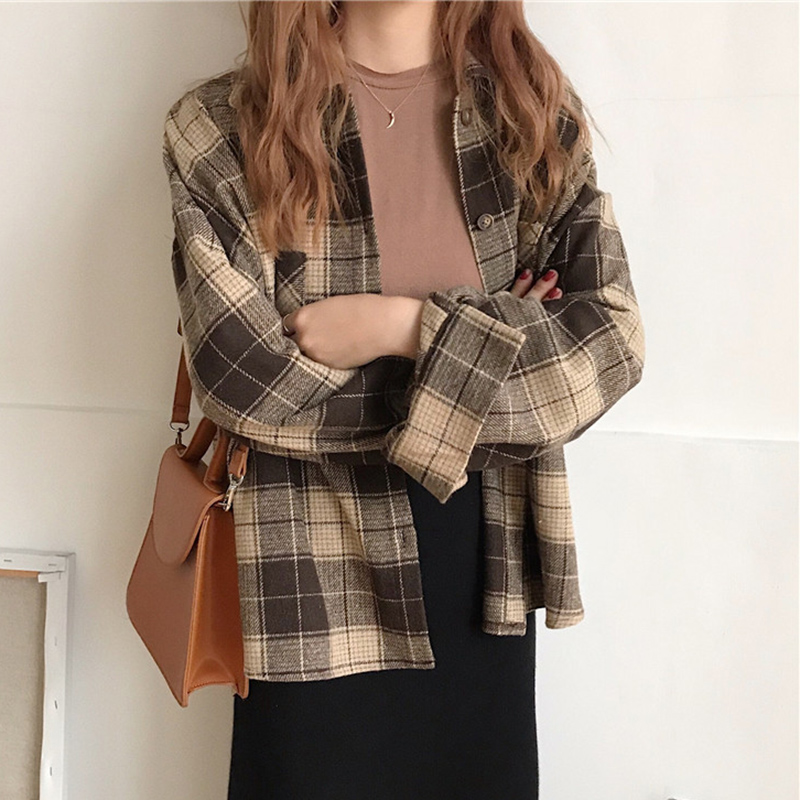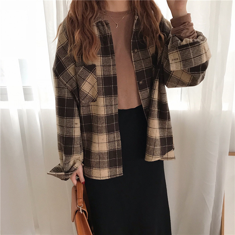 / 中長毛呢格子外套女裝秋季2018新款復古港味寬松上衣學生長袖襯衫