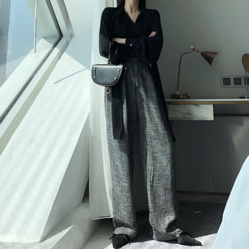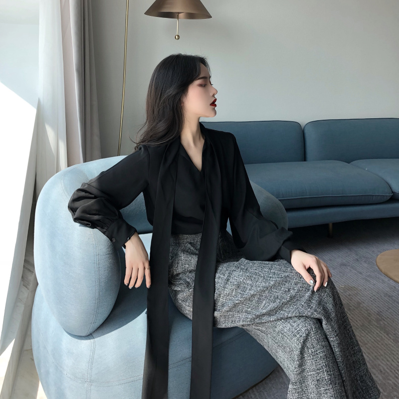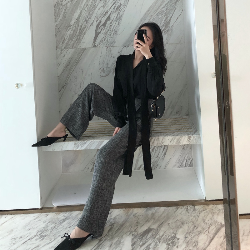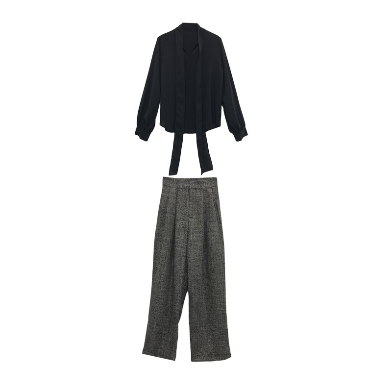 / 韓版慵懶風飄帶領漏肩鎖骨上衣+墜感闊腿褲高腰復古直筒拖地褲女