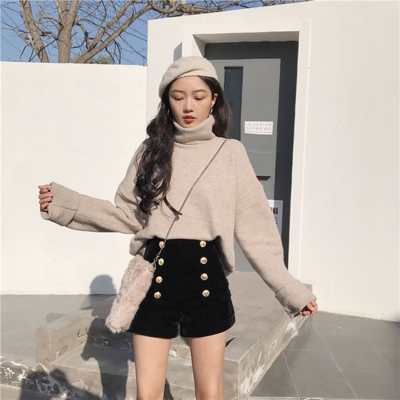 褲子女2018新款韓版百搭高腰時尚港風chic氣質秋季雙排扣絲絨短褲