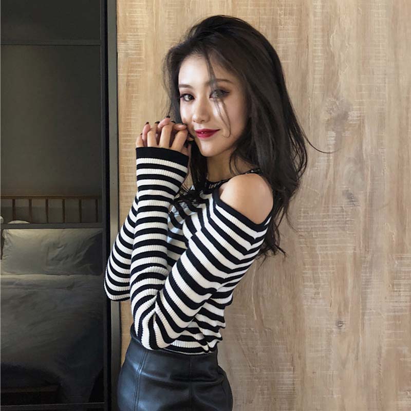 / 秋裝女2018新款小心機露單肩掛脖針織衫字母條紋修身長袖打底上衣