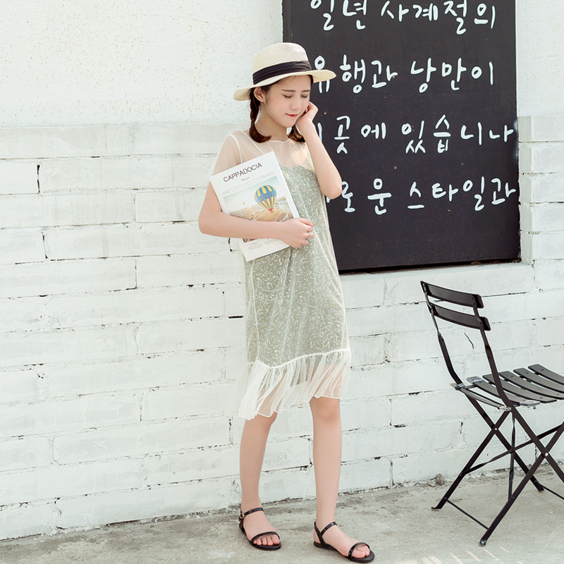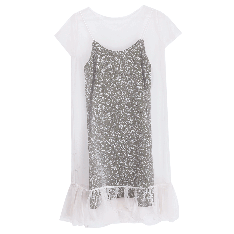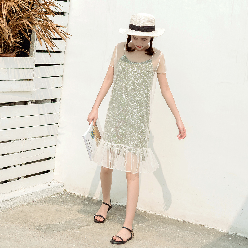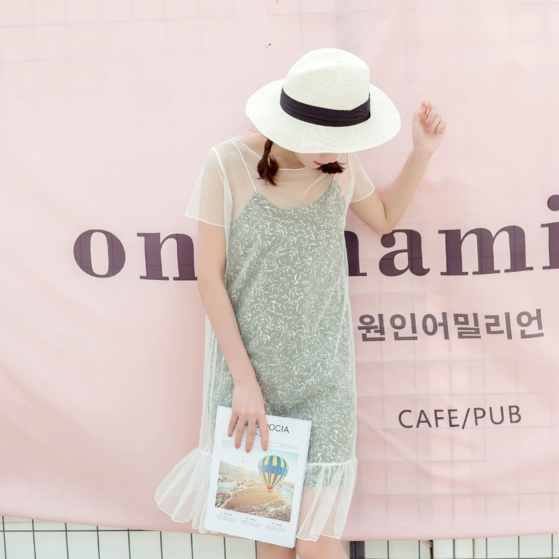 / 夏季新款女裝韓版短袖連衣裙中長款碎花吊帶網紗兩件套裙子潮