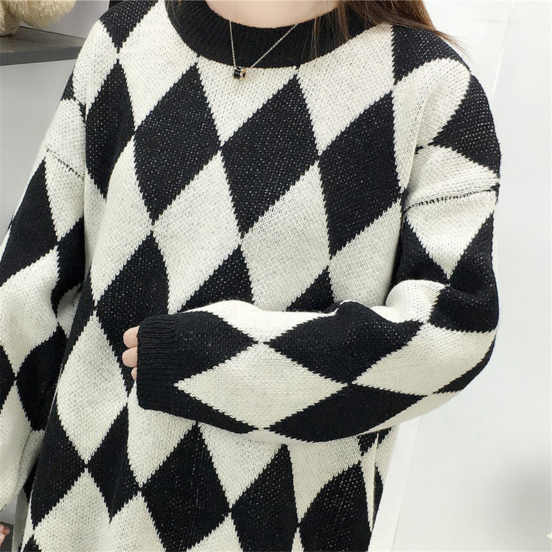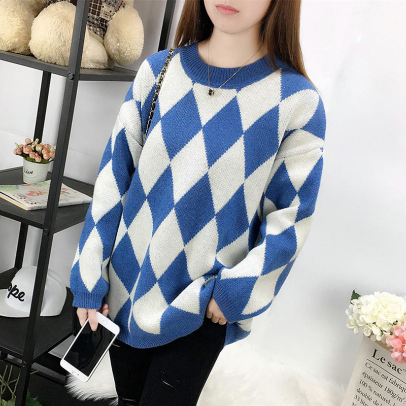 小清新套頭針織衫女秋冬裝2018新款慵懶風寬松撞色菱格毛衣外套潮