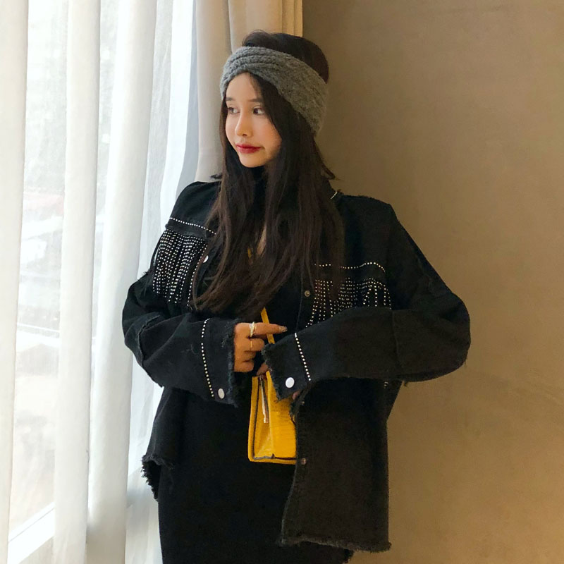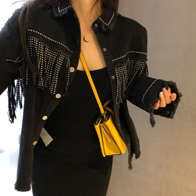 網紅同款外套女秋裝2018新款氣質流蘇牛仔夾克黑色外套重工藝上衣