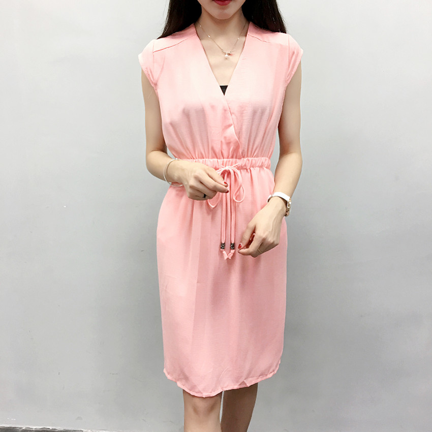 裙子女夏2017新款韓版收腰顯瘦V領短袖中長款大碼夏季連衣裙中裙
