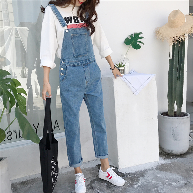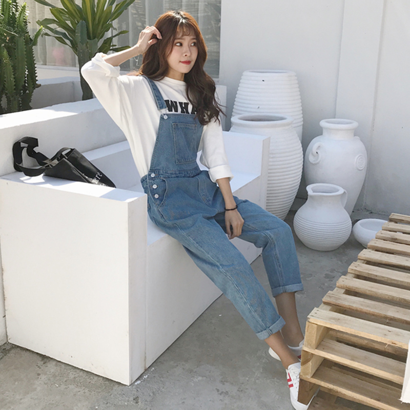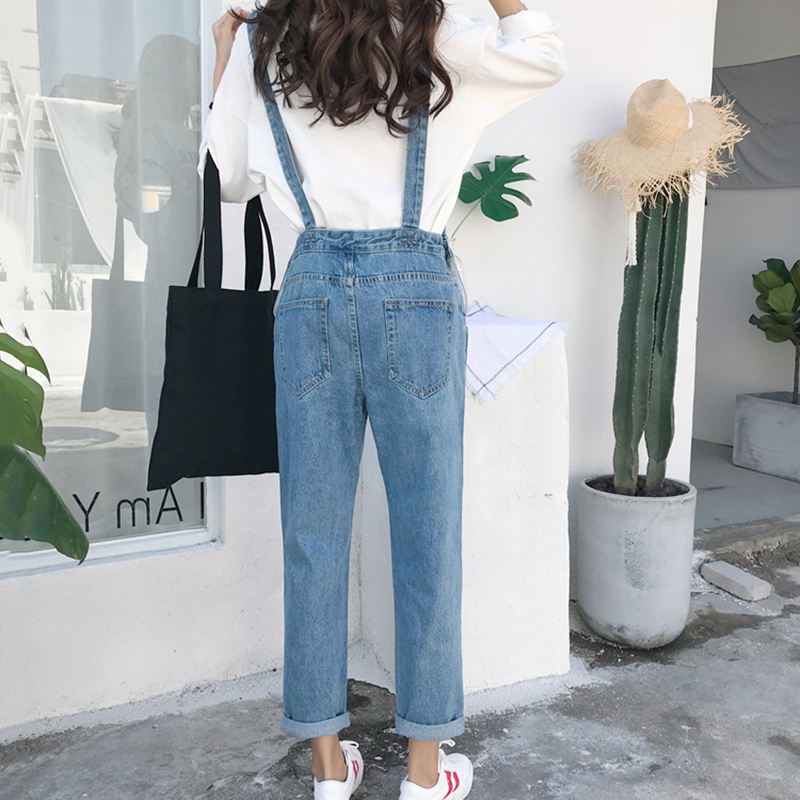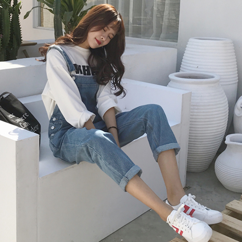 秋裝女2018新款韓版學生寬松淺色牛仔背帶褲少女時尚休閑連體褲子
