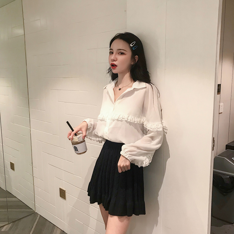 / 網紅同款套裝氣質慵懶長袖寬松白襯衫+針織半身高腰百褶裙兩件套