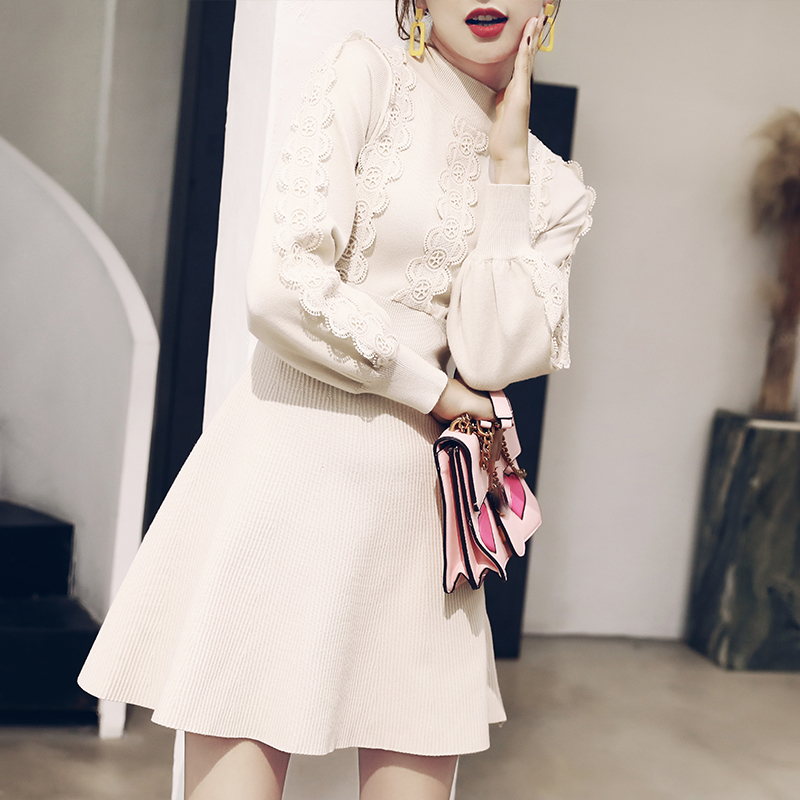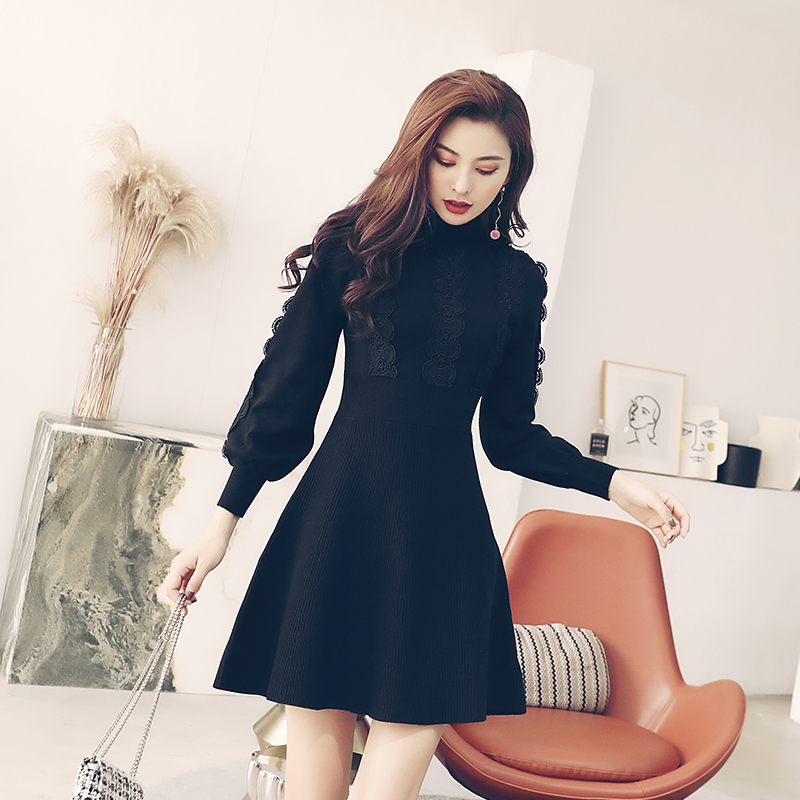 甜美氣質2018秋女裝裙新款針織半高領長袖氣質收腰純色高腰連衣裙