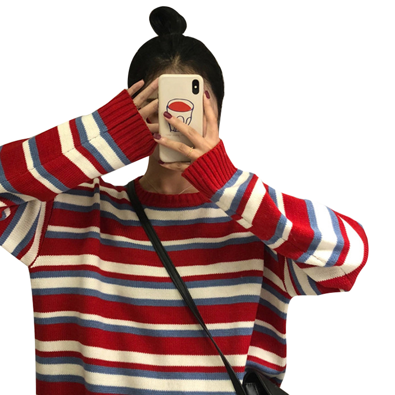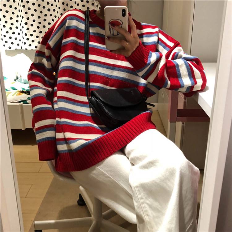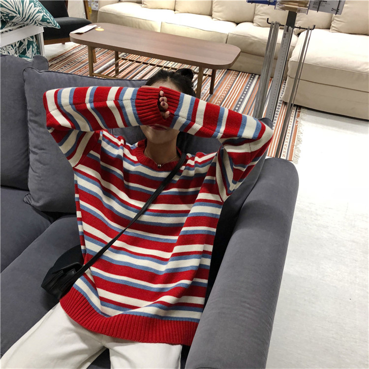 / 秋冬女裝韓版寬松復古慵懶風彩色條紋套頭超火毛衣針織衫上衣外套