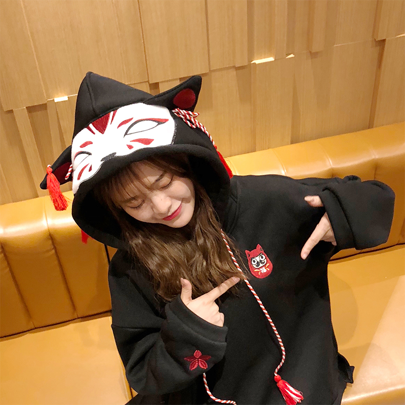 / 秋冬韓版寬松卡通繡花小花貓加絨加厚連帽套頭超火衛衣上衣外套女