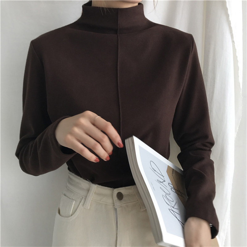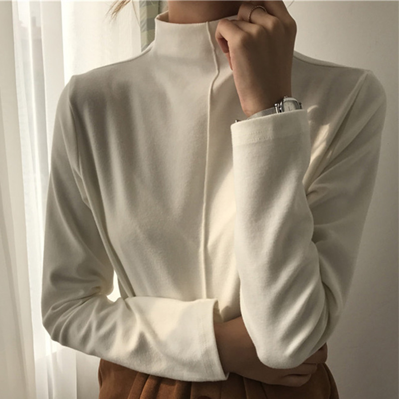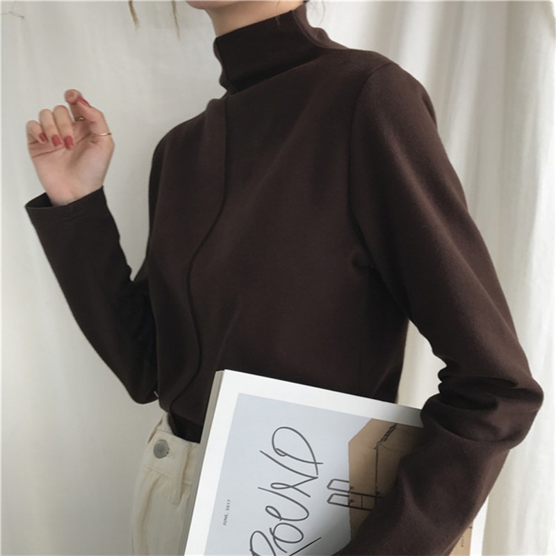 / 時尚半高領黑T恤秋裝女2018新款個性線條修身打底衫學生長袖上衣