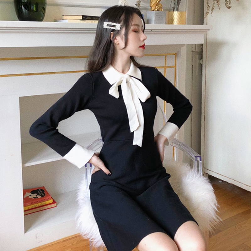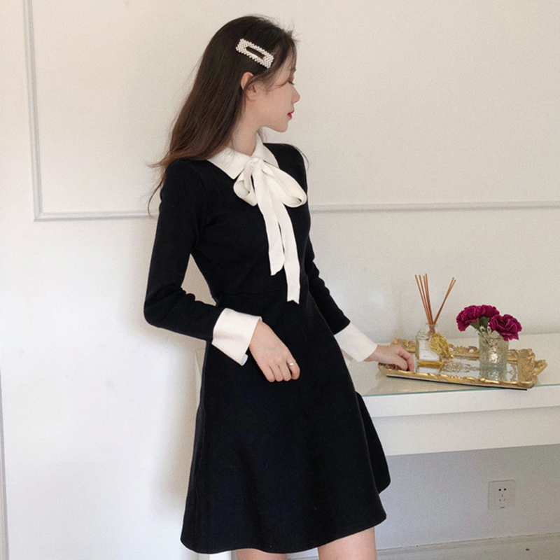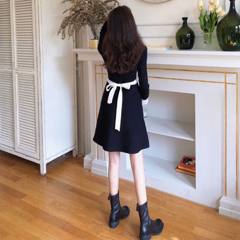 / 中長款裙子女秋冬裝2018新款氣質顯瘦蝴蝶結綁帶A字針織連衣裙子
