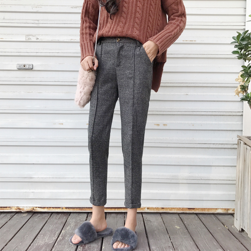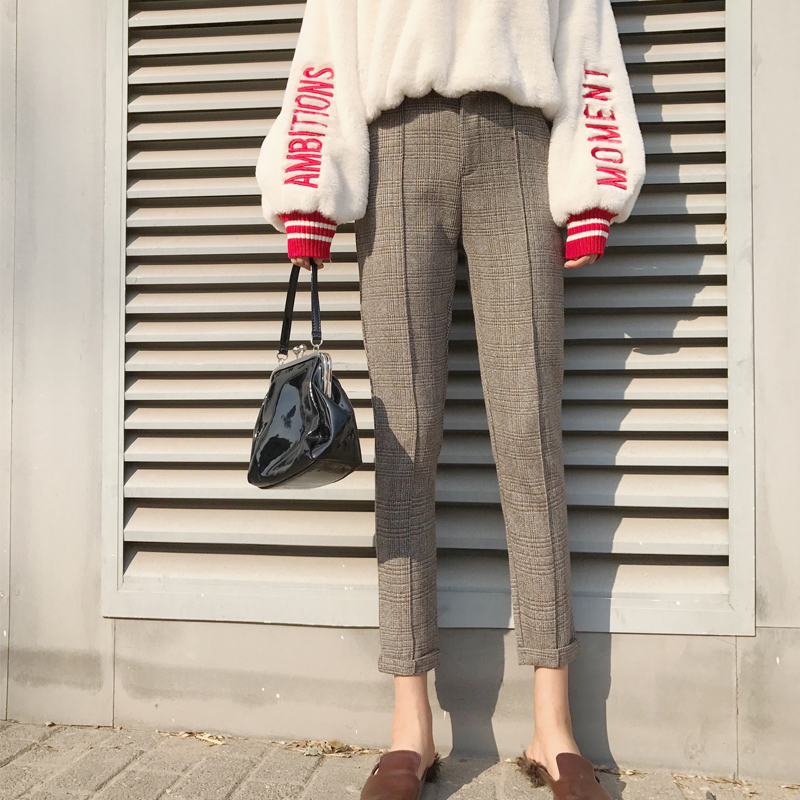 / 韓國chic復古褲子女秋2018新款毛呢格子哈倫褲高腰顯瘦九分西裝褲