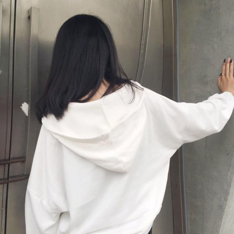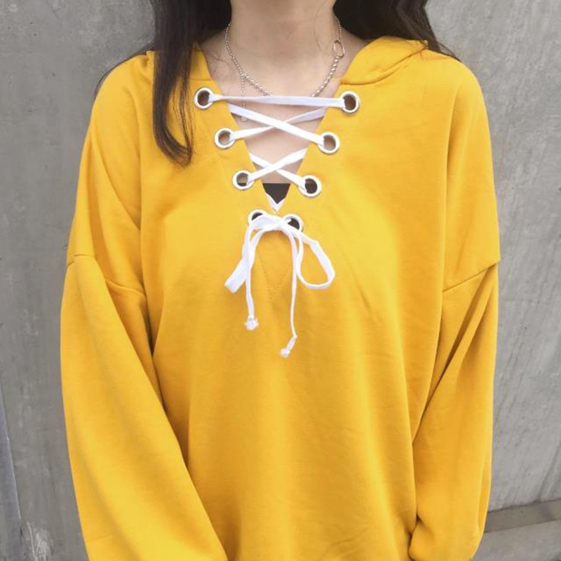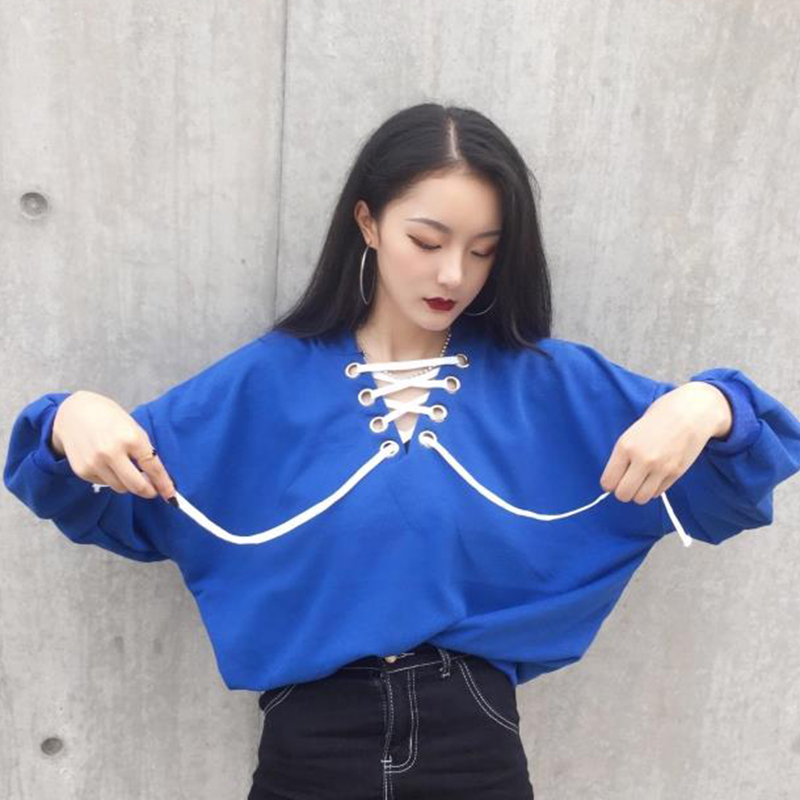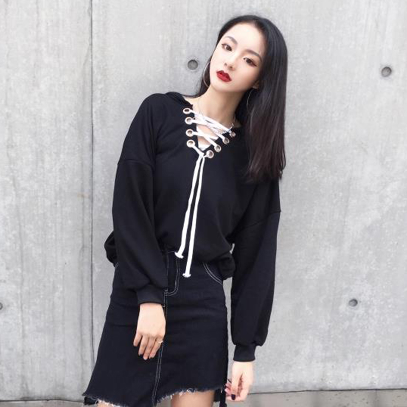 / 秋季新款女裝原宿風V領系帶連帽休閑寬松休閑長袖衛衣學生上衣潮