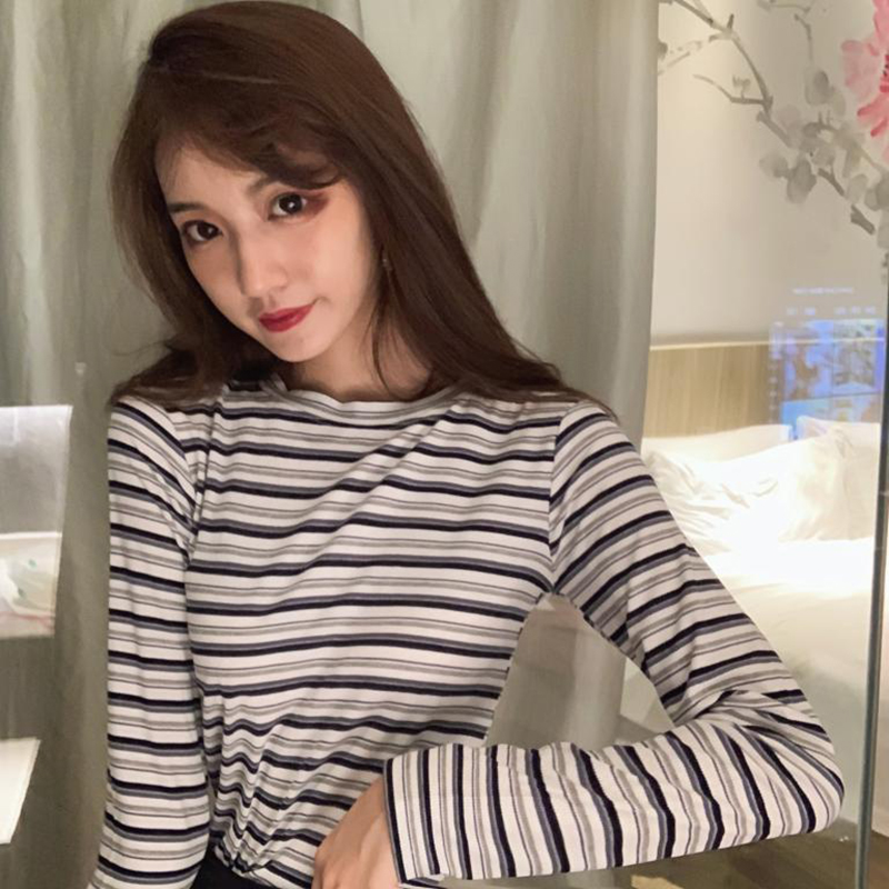 秋裝女2018新款韓版條紋長袖T恤學生修身打底衫百搭圓領體恤上衣