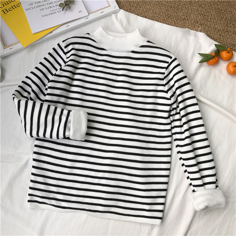 / 學生寬松上衣秋冬女裝2018新款加絨保暖毛衣條紋長袖針織打底衫潮