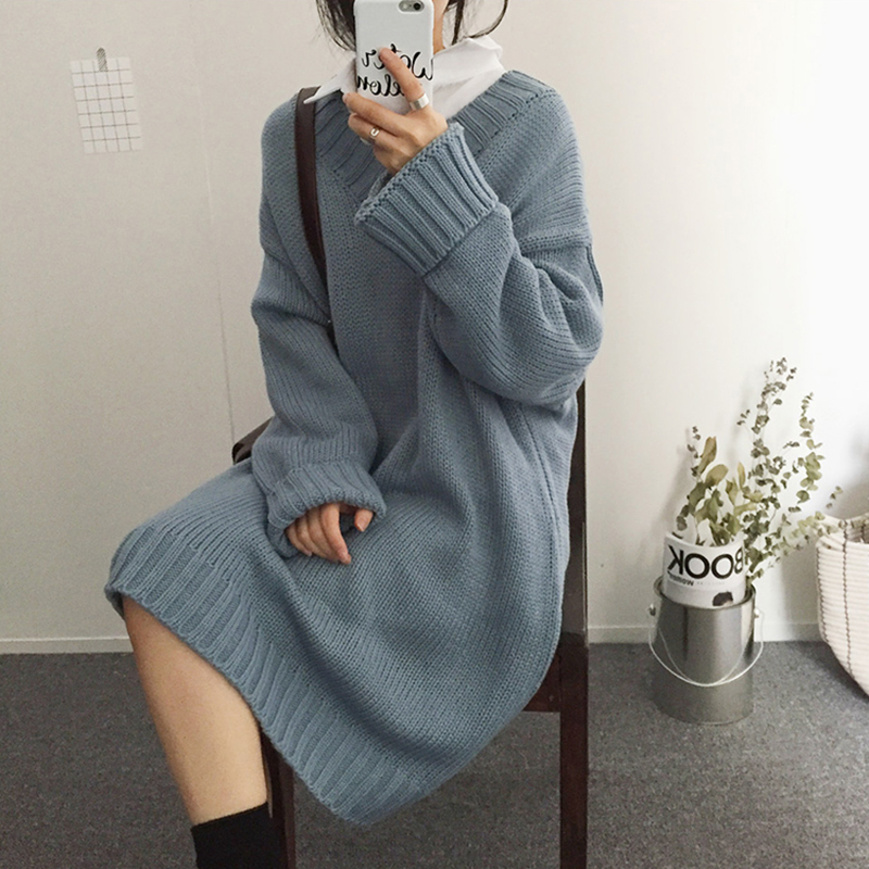 / 秋裝女裝韓版慵懶風寬松V領毛衣中長款長袖針織衫連衣裙上衣外套