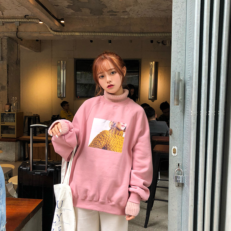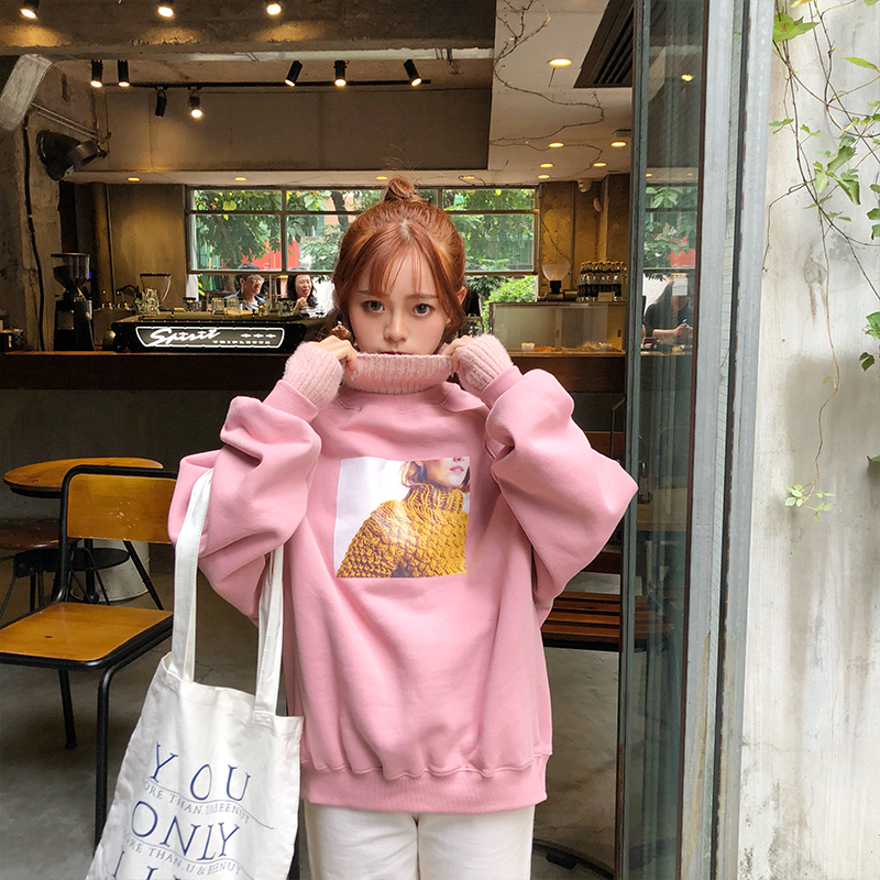 / 秋冬韓版原宿風寬松個性人物拼接高領加絨加厚套頭衛衣上衣外套女