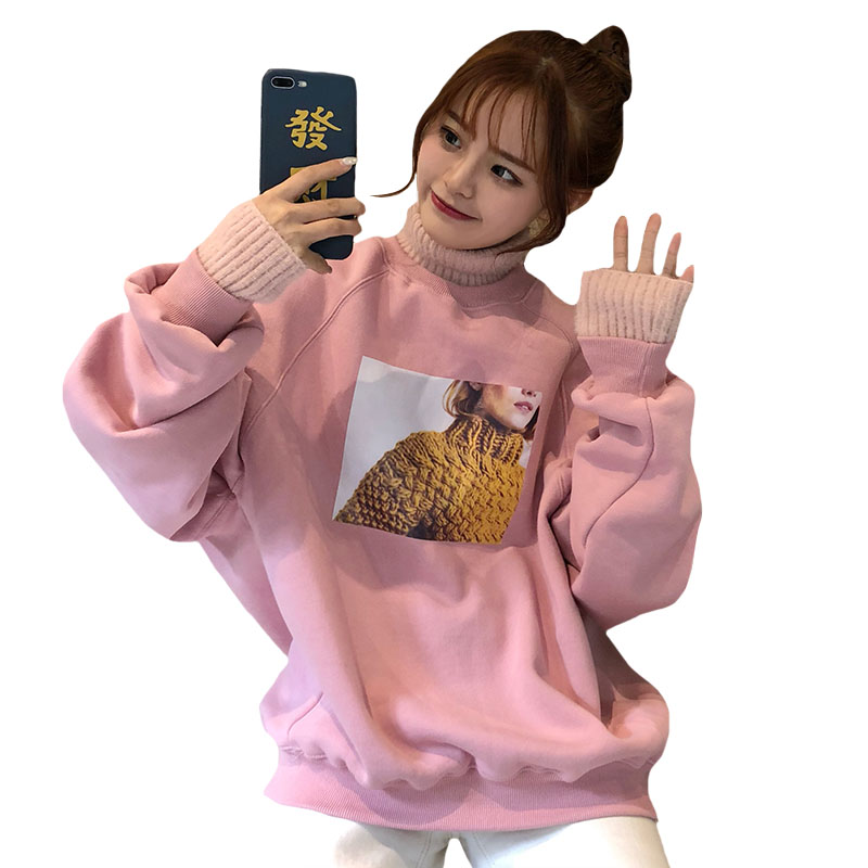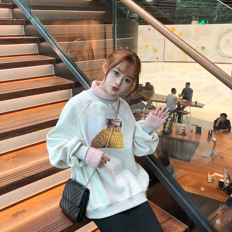 秋冬韓版原宿風寬松個性人物拼接高領加絨加厚套頭衛衣上衣外套女