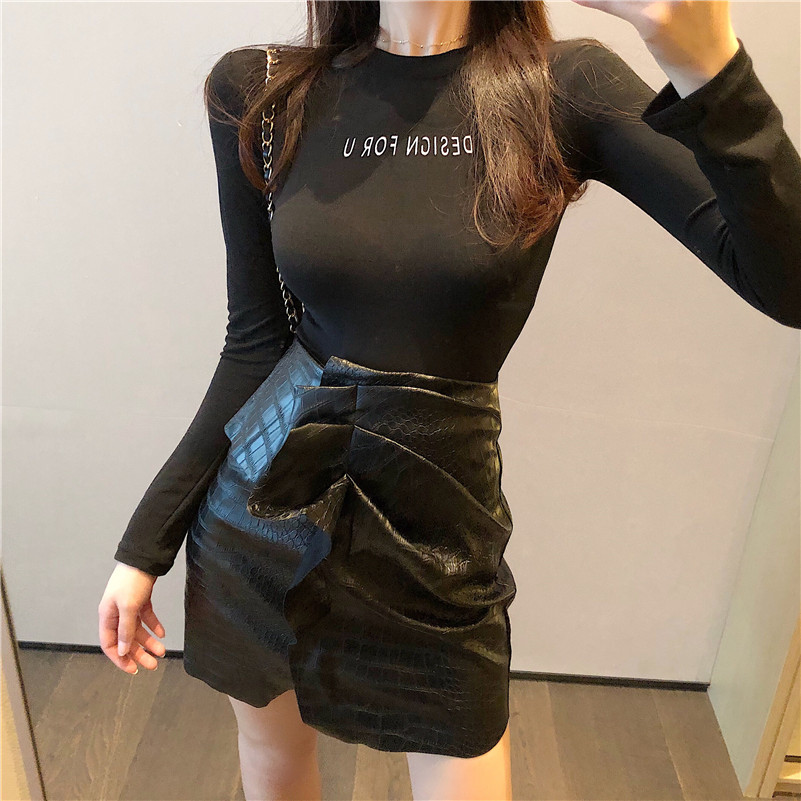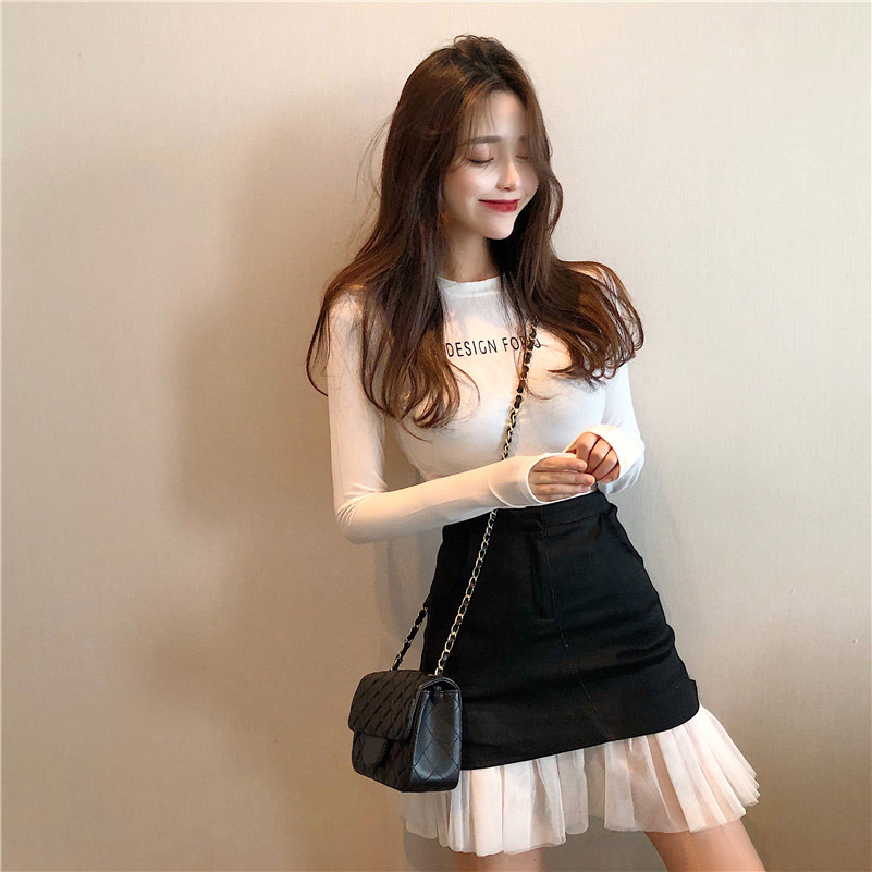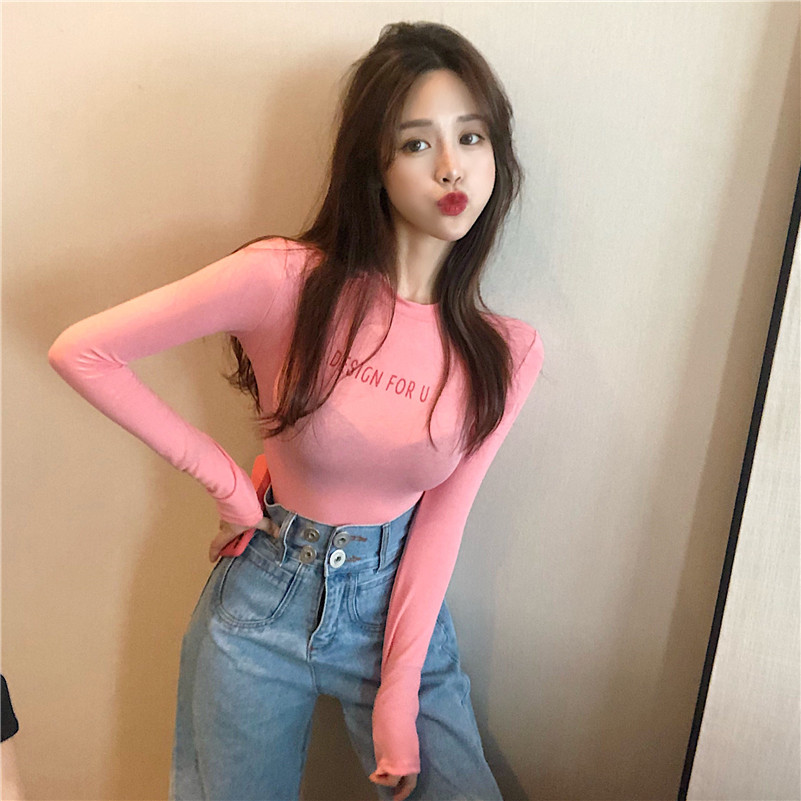 早秋新款修身顯瘦彈力長袖T恤女字母印花復古chic風百搭打底上衣