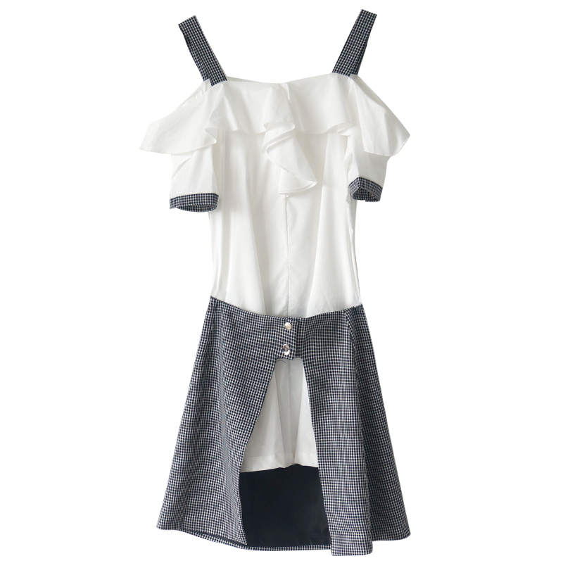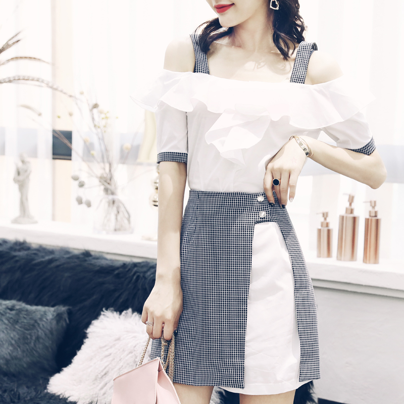 / s秀名媛氣質2918夏新品吊帶襯衫上衣連衣裙格子半身裙套裝兩件套