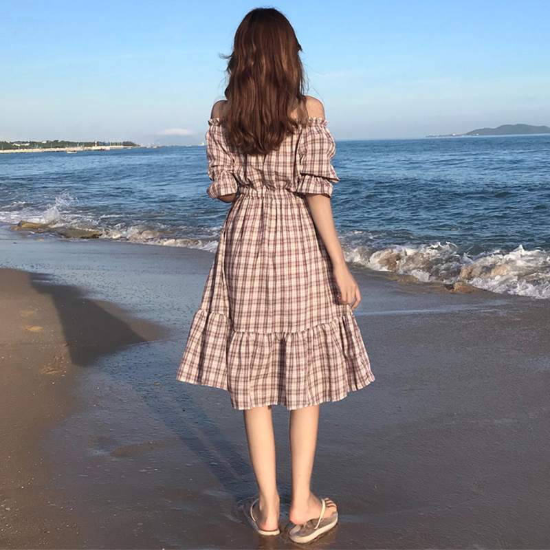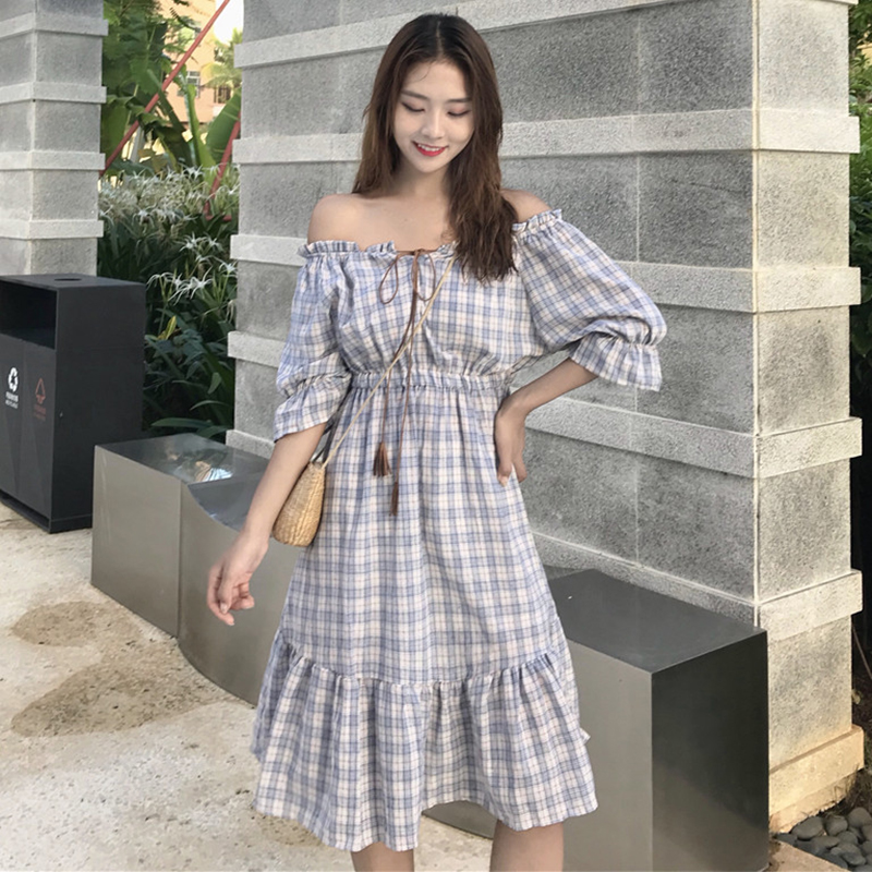 連衣裙女夏新款韓版女裝小清新露肩一字領燈籠袖格子荷葉邊中長裙