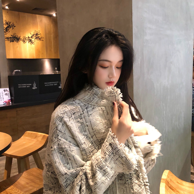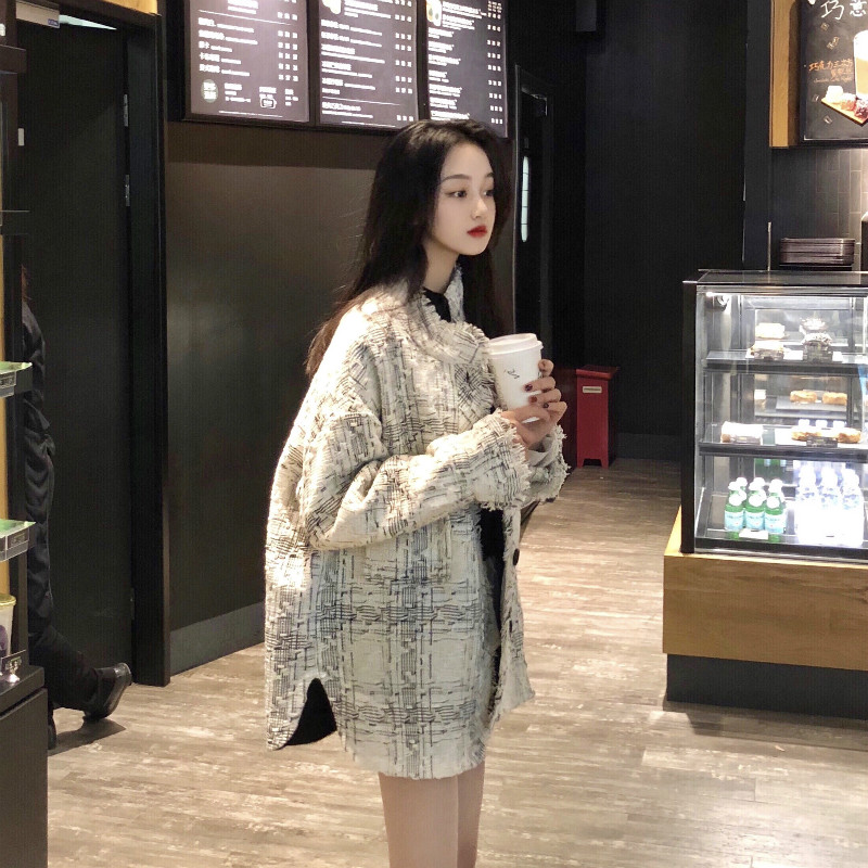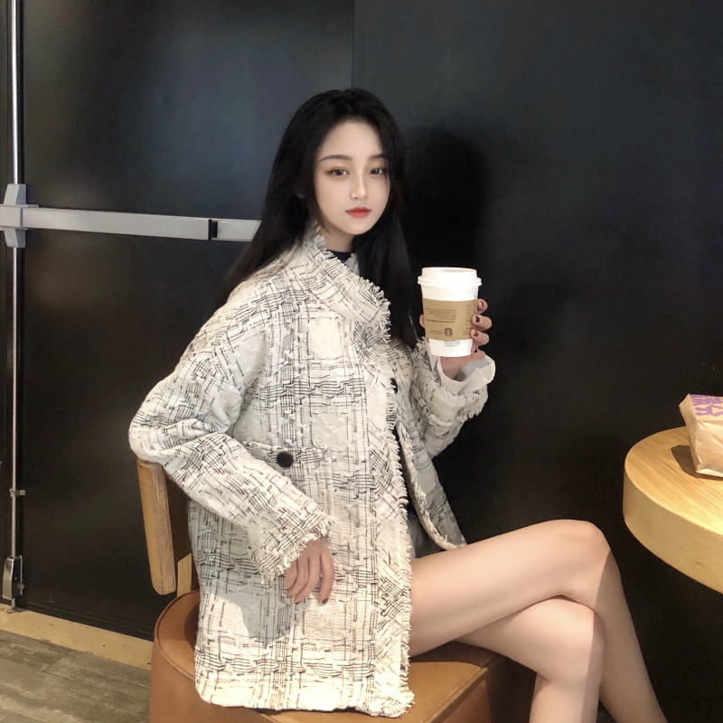 韓版復古小香風格子毛呢外套女中長款加厚粗花呢上衣夾克大衣女潮