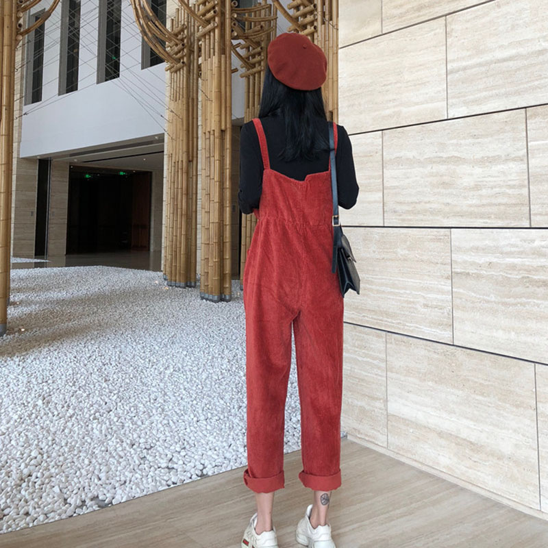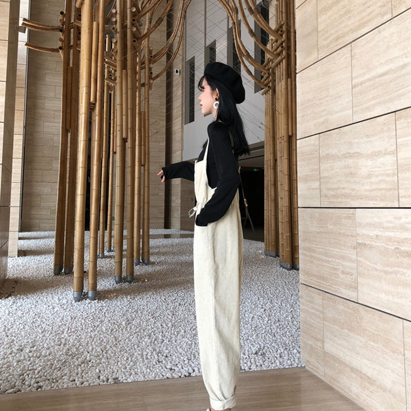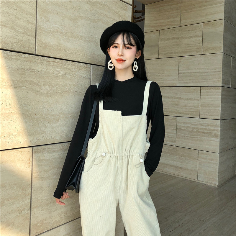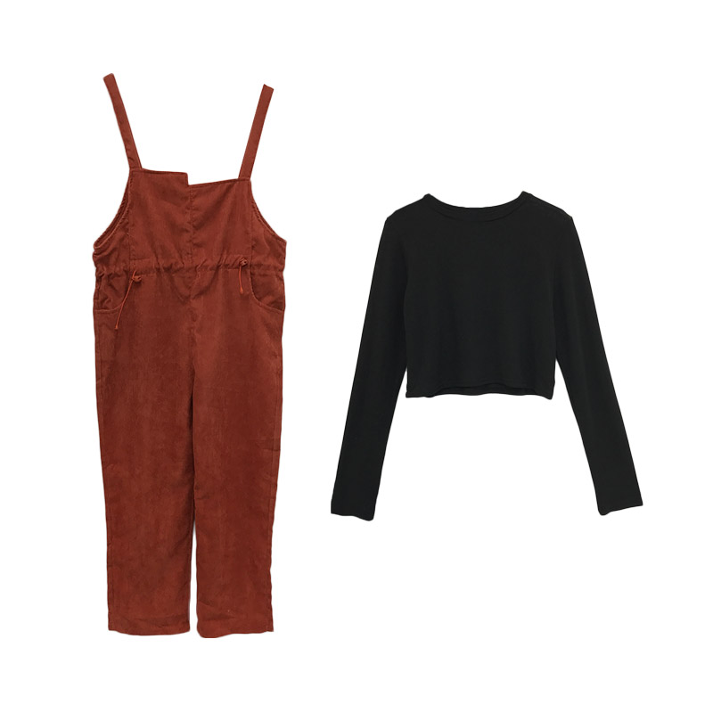秋裝女2018新款套裝時尚兩件套網紅純色打底衫+燈心絨收腰背帶褲