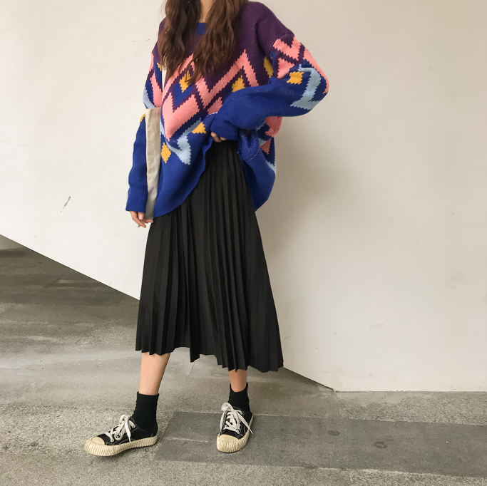 韓版時尚休閑套裝秋季撞色中長款針織毛衣+壓褶半身長裙兩件套女