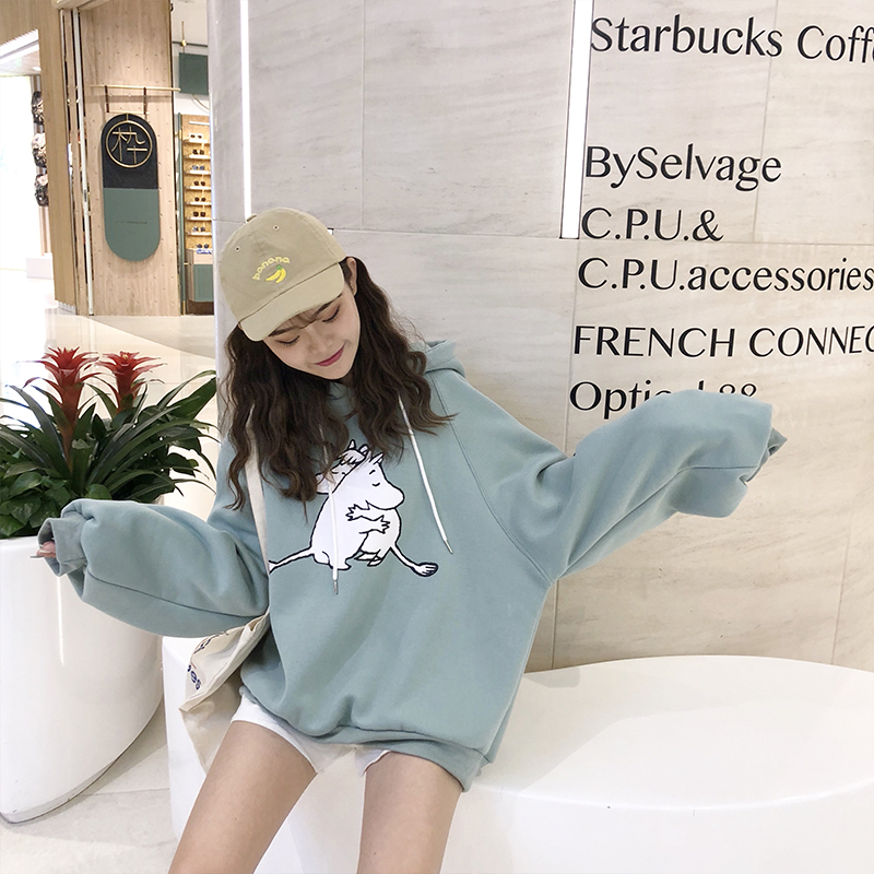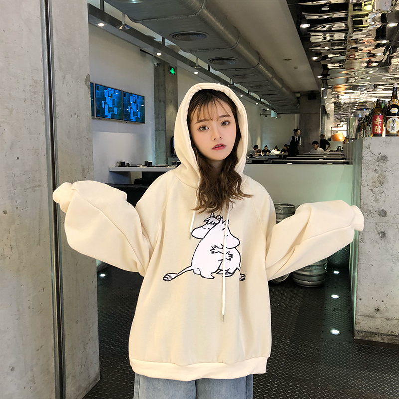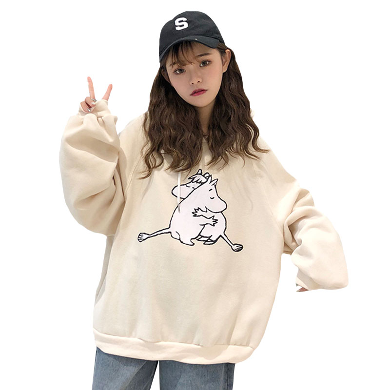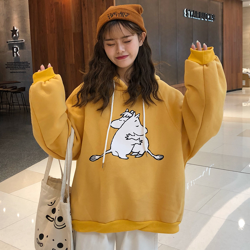 / 冬季韓版寬松原宿風卡通動物連帽加絨加厚套頭超火衛衣上衣外套女