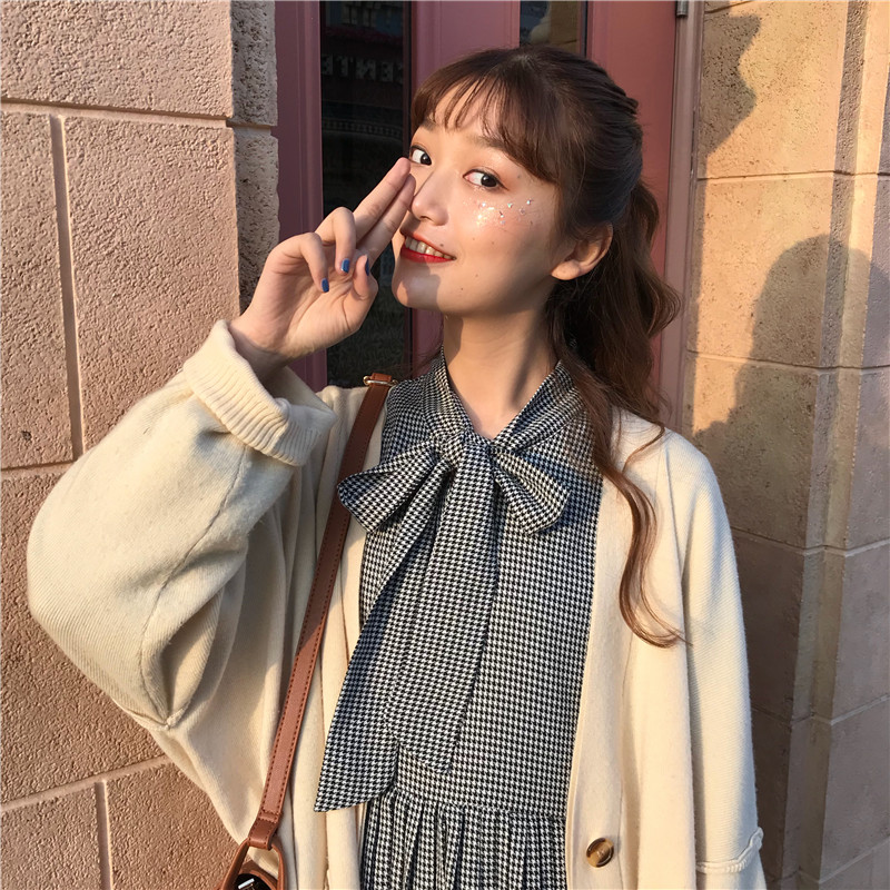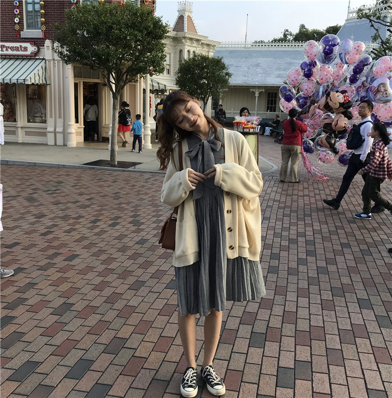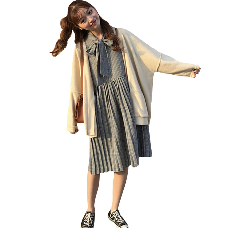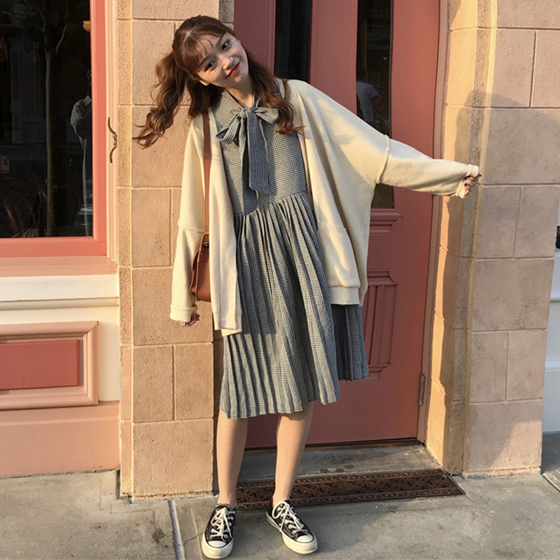 / 秋裝韓版氣質顯瘦高腰中長款寬松長袖格子連衣裙百褶長裙女+毛衣