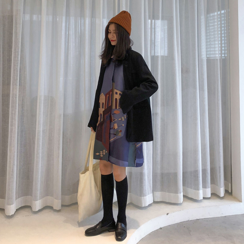 / ins中長款建筑印花襯衫裙女秋冬裝2018新款復古寬松打底連衣裙子