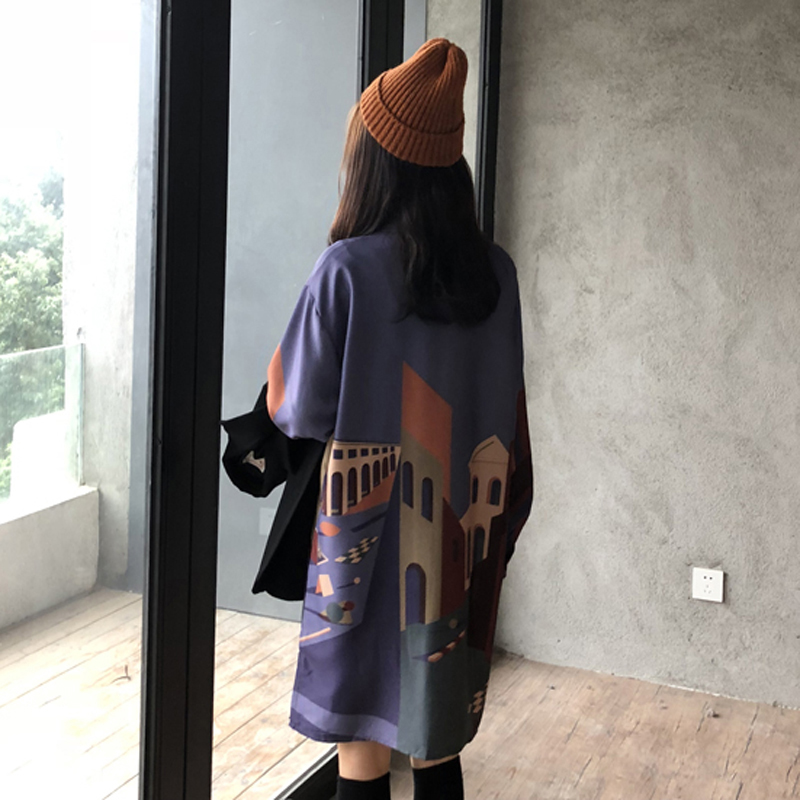 ins中長款建筑印花襯衫裙女秋冬裝2018新款復古寬松打底連衣裙子