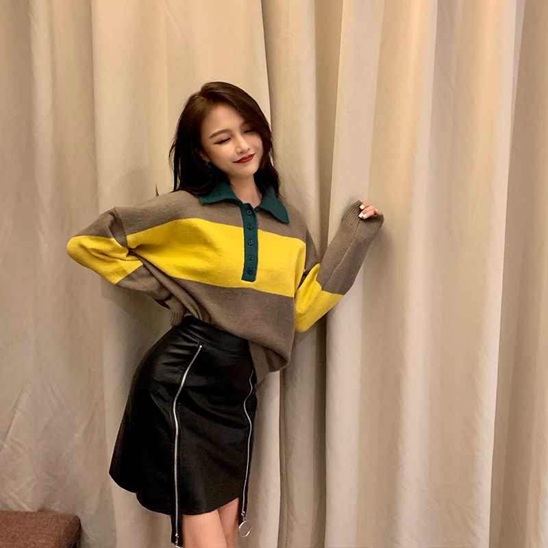 / 港味chic秋冬POLO領長袖條紋拼色T恤女潮寬松顯瘦長袖時尚打底衫