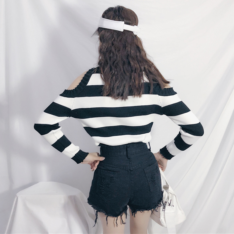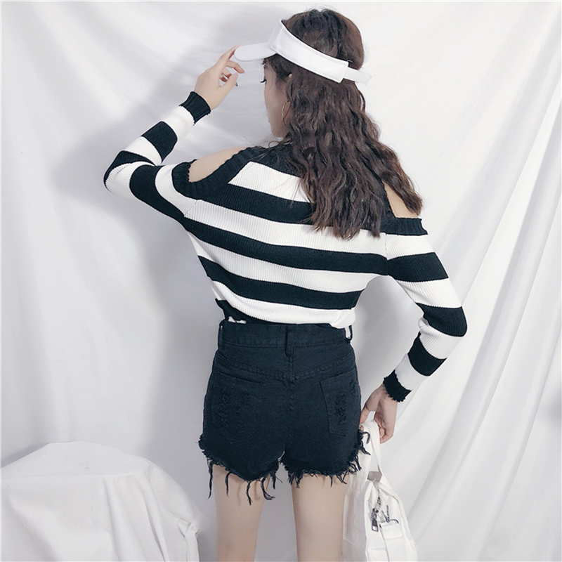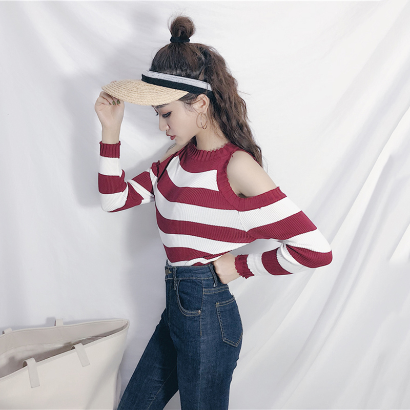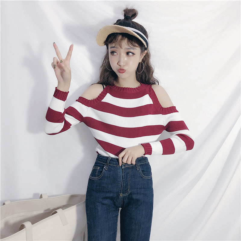 條紋針織衫女秋裝2018新款韓版學生長袖露肩上衣時尚修身短款毛衣