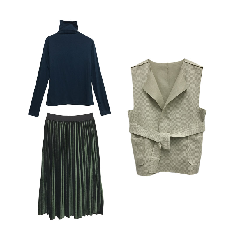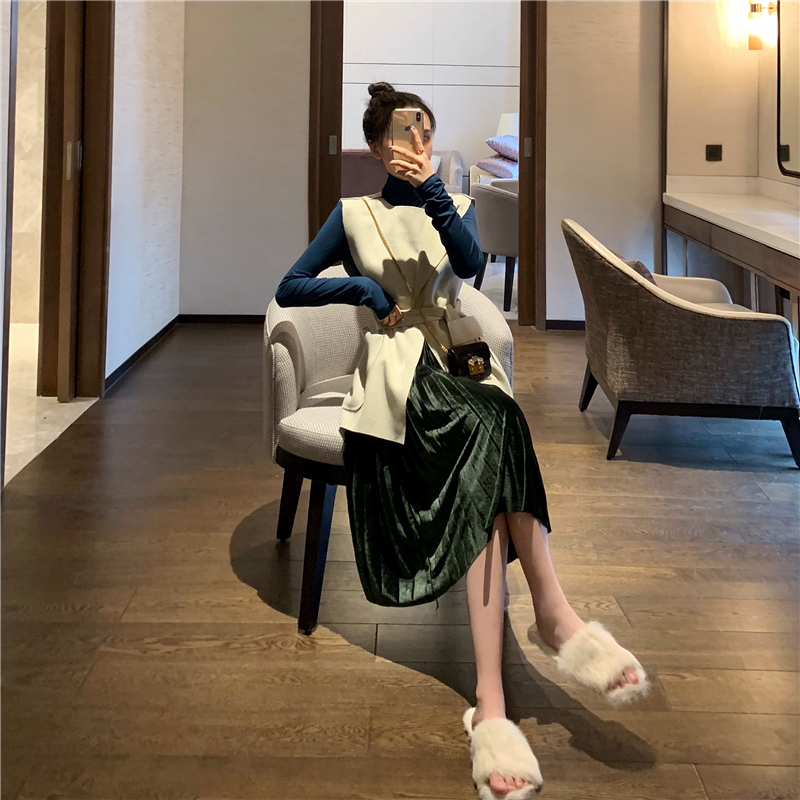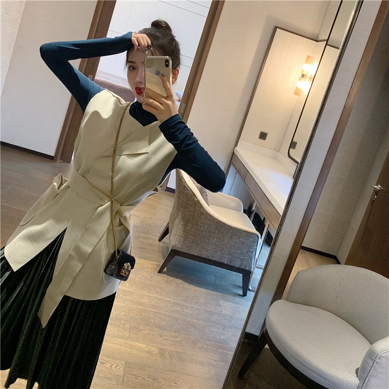 / 秋季套裝時尚斜紋腰帶馬夾呢外套女+超柔高領打底上衣+高腰百褶裙
