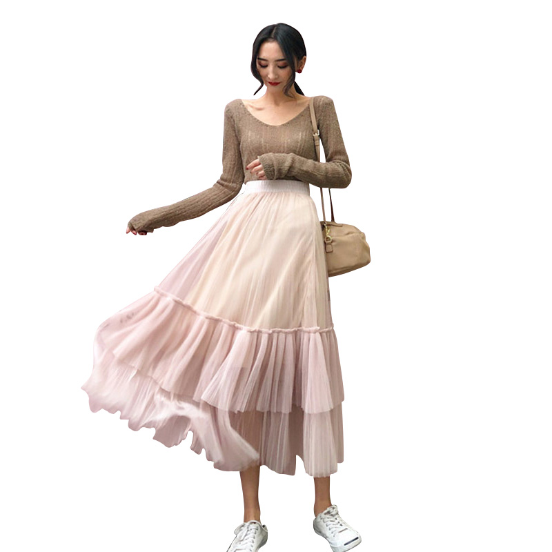 2018新款韓版裙子秋裝甜美氣質仙女顯瘦百褶蓬蓬網紗中長款半身裙