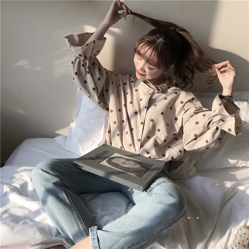 / 秋裝女裝2018新款韓版寬松波點燈籠袖長袖襯衫打底衫學生休閑襯衣