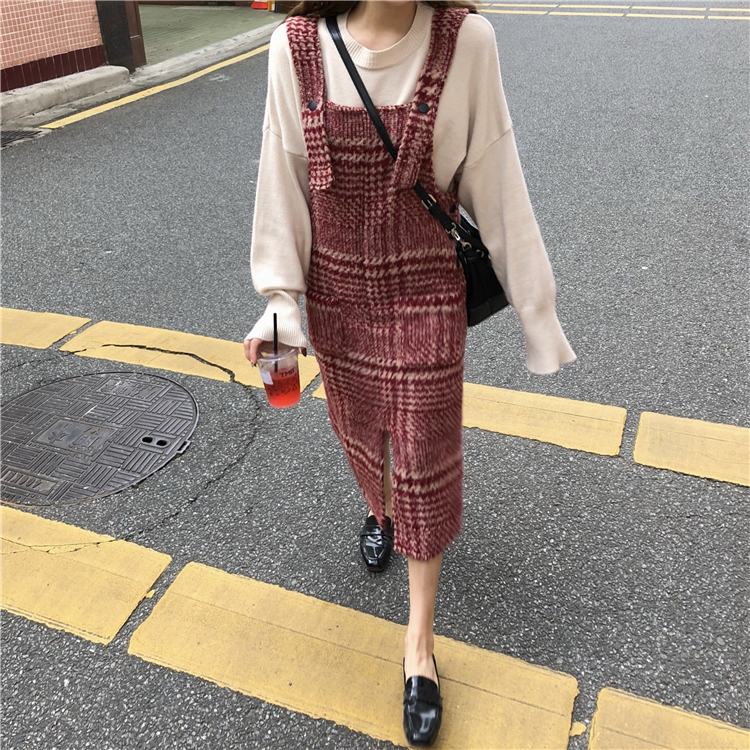 秋裝女新款溫柔風百搭款打底衫+紅色格子收腰背帶裙中長款連衣裙