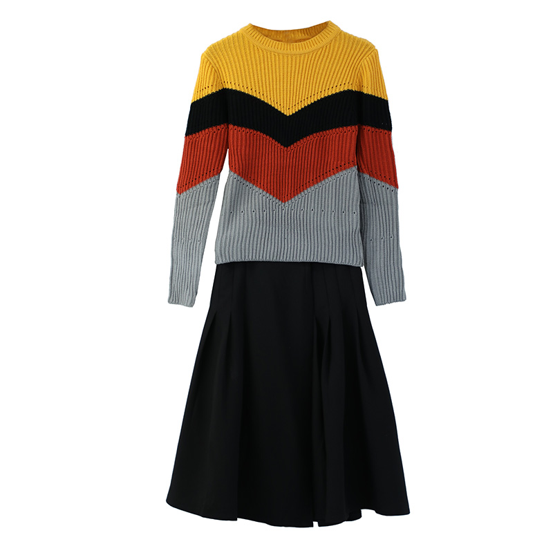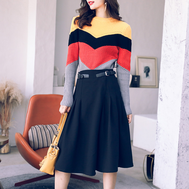 名媛氣質秋冬季兩件套2018新款針織拼接上衣顯瘦半身裙時尚套裝裙