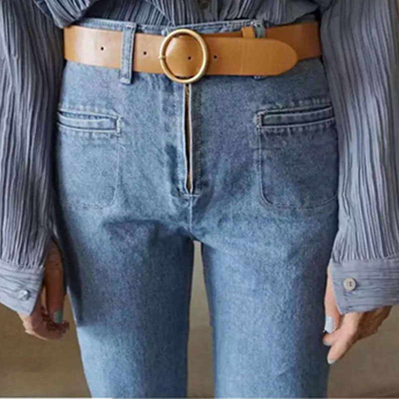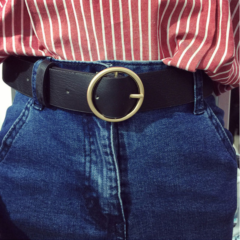 包郵 韓版2018新款潮流百搭簡約圓形金屬PU皮女式寬腰帶針扣皮帶