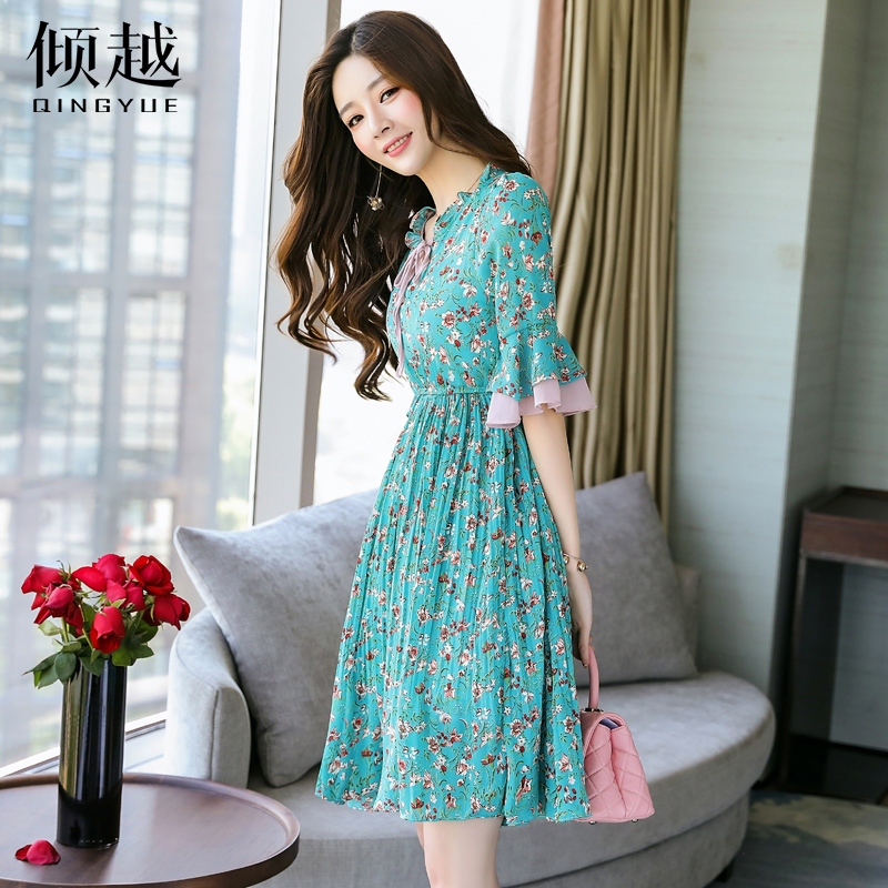 2017甜美小清新淑女雪紡連衣裙韓版碎花松緊腰荷葉袖修身百褶裙夏