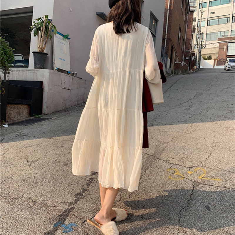 秋冬女裝2018新款韓版白色雪紡A字連衣裙寬松長袖egg風荷葉邊裙子
