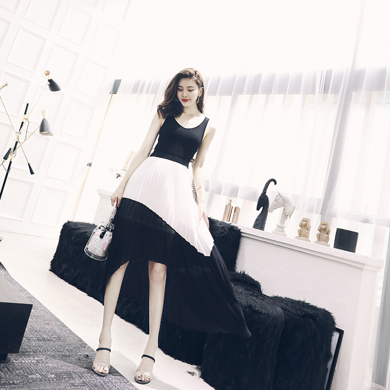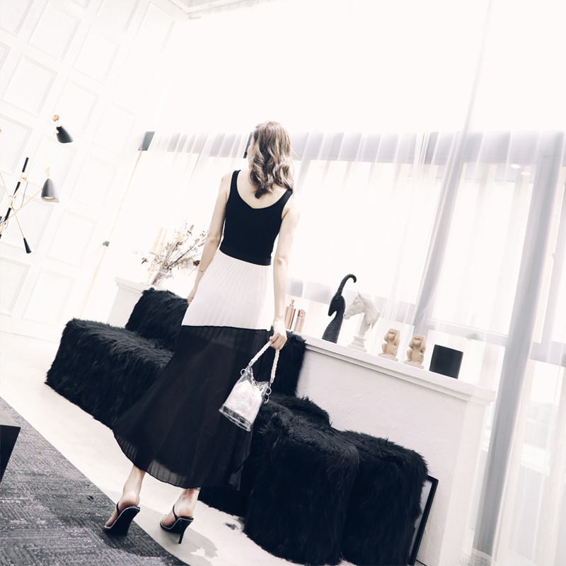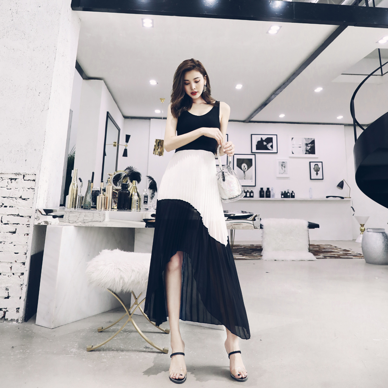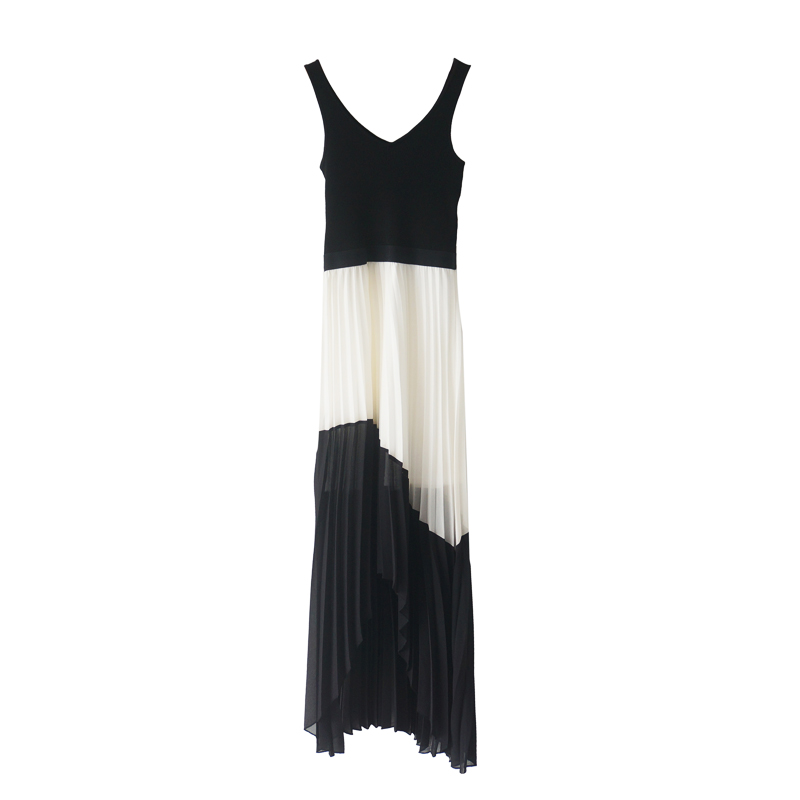 / 名媛氣質中長款夏裙子2018新品針織雪紡拼接顯瘦不規則百褶連衣裙